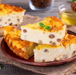 3 Čisto na koncu vmešamo še rozine skupaj z limoninim sokom. Okroglo tvorilo dobro namastimo in vanj razporedimo maso. Pečemo 20 minut, nato znižamo temperaturo na 180°C in pečemo še 30 minut. Pečeno vzamemo iz pečice, pustimo, da se malo ohladi in postrežemo še mlačno.