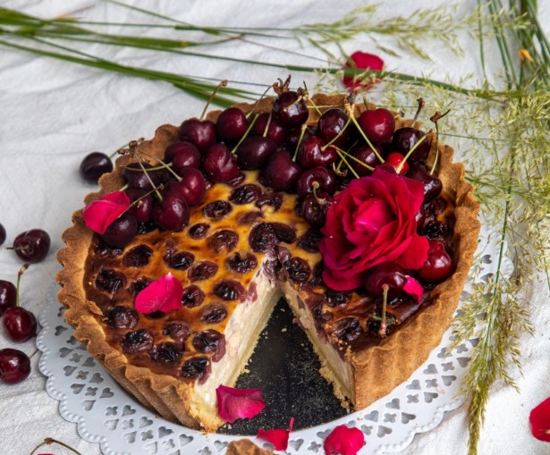 5. Ko je testo deloma pečeno, ga vzamemo iz pečice in obložimo z nadevom, po vrhu pa naložimo višnje. Zelo koristno je, da vsako prej pregledamo, da se ne bi ukvarjali s polomljenim zobom zaradi koščice.