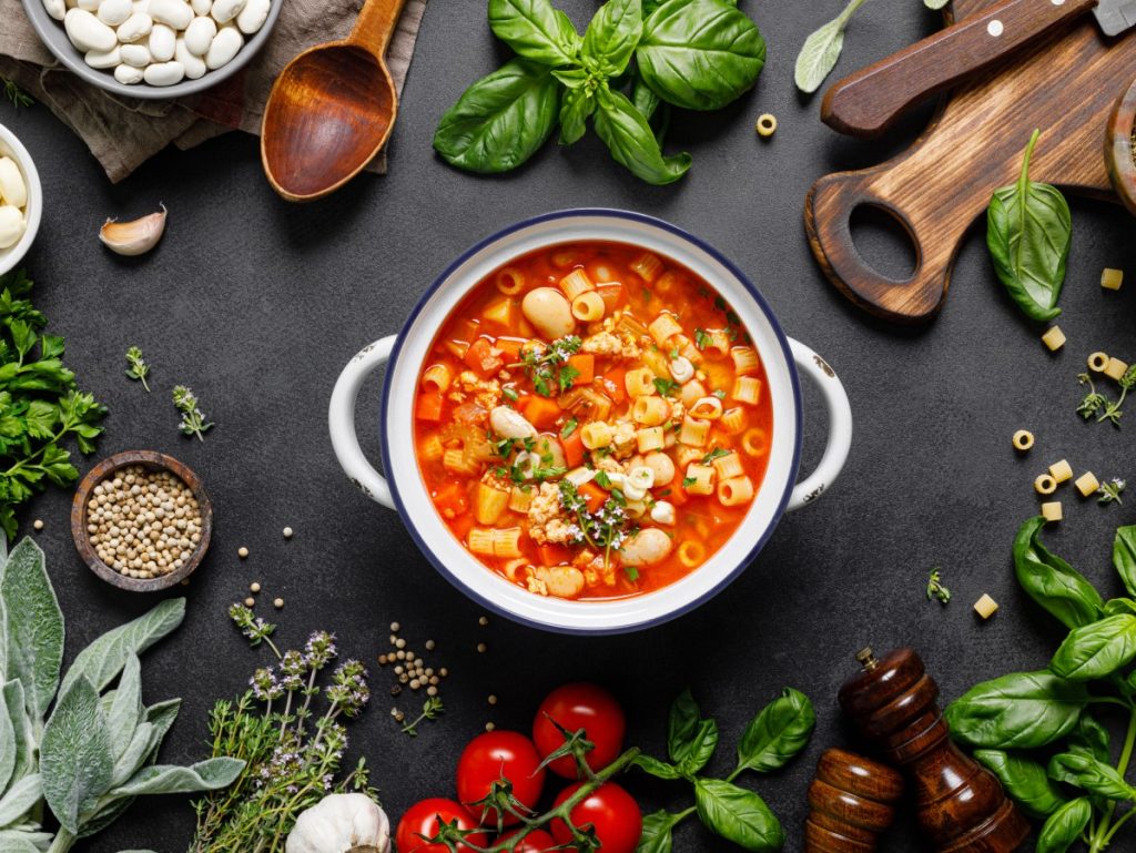 5. Zmešamo ves fižol, testenine, čebulo in paradižnikovo omako. Kuhamo še kratek čas, da se testenine ujamejo z juho, in po okusu še dodamo začimbe. Večkrat premešamo po dnu.