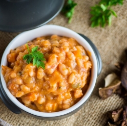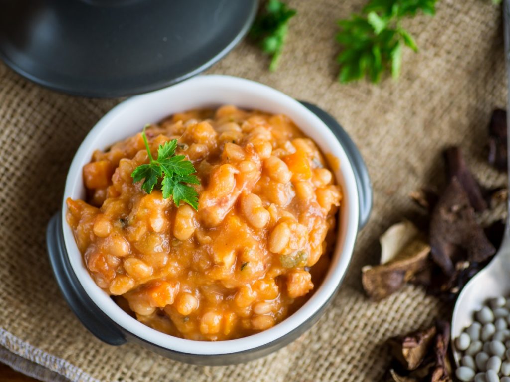 5. Stebla pora po dolgem prerežite in z žlico izdolbite mehko pečeno notranjost. Sesekljajte jo in dodajte v omako skupaj z odcejenim fižolom. Vse skupaj dobro premešajte, da se okusi povežejo, nato pa ognjevarno ponev prestavite v pečico za 15 do 20 minut, da se zgornji del zlato zapeče.