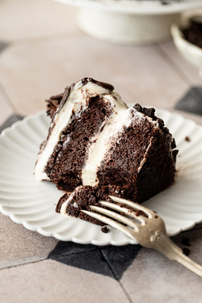 Po strjeni čokoladi torto okrasite s kakavovo mascarpone kremo, z nastavkom za pipetiranje, po želji pa posujte z dodatnimi piškoti. 30 minut pred postrežbo hranite torto v hladilniku, da se biskvit otopli.