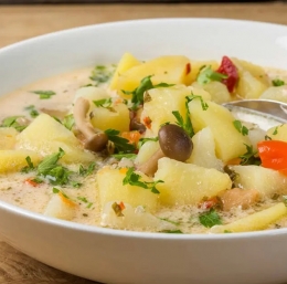 6 Ko je krompir kuhan, lahko juho delno palično zmiksate, da postane kremna, vendar pustite nekaj kock krompirja in gob, da bo juha bolj teksturirana.