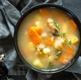 3 Kuhane ribe poberemo iz juhe in jim odstranimo vse kosti. Juho precedimo in vanjo stresemo prepraženo čebulo s paradižnikom.