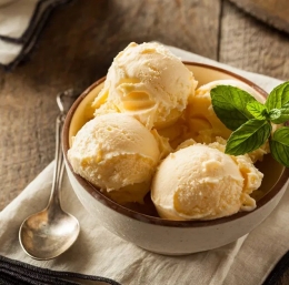 5 Če želimo res kremast sladoled, ga vsake toliko z vilicami premešamo, da razbijemo kristalčke. Ko sladoled postane kremast, mazljiv in ravno prav zamrznjen, ga damo v posodice in postrežemo.