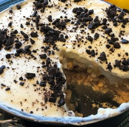 2 V vmesnem času po receptu skuhamo puding. Nato nalomimo piškote in stepemo smetano, ki ji, ko je že stepena, nežno vmešamo maskarpone.