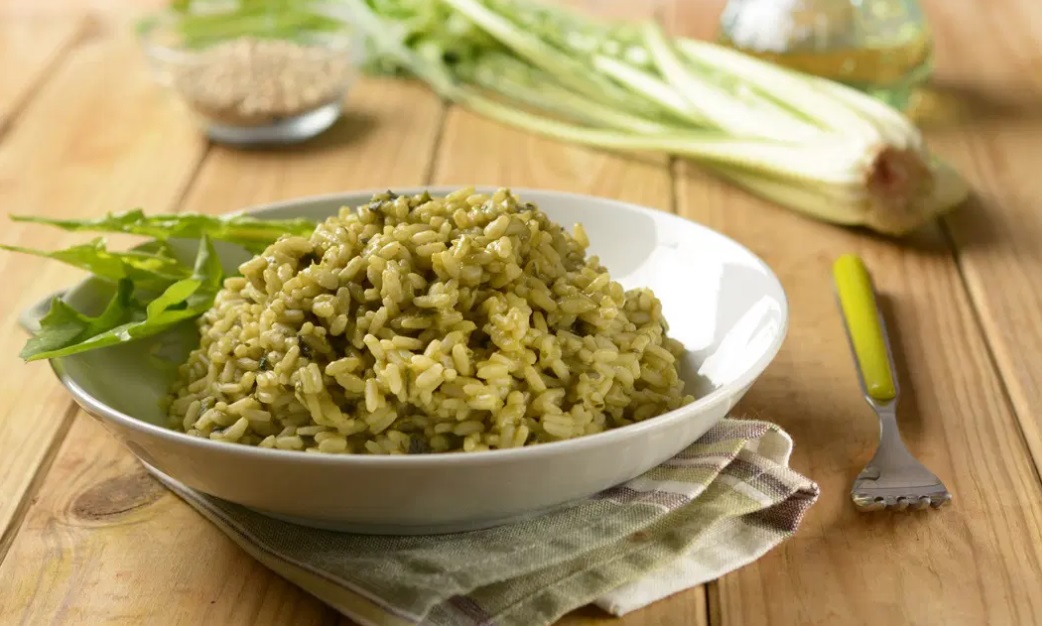 1 Čebulo drobno nasekljamo, jo solimo in popražimo na oljčnem olju, da se razpusti. Dodamo nasekljan česen in pražimo, da zadiši, nato v ponev dodamo riž. Na hitro ga popražimo in zalijemo z tremi zajemalkami vode ali jušne osnove. Solimo in popramo po okusu, po želji dodamo tudi malo čilija.