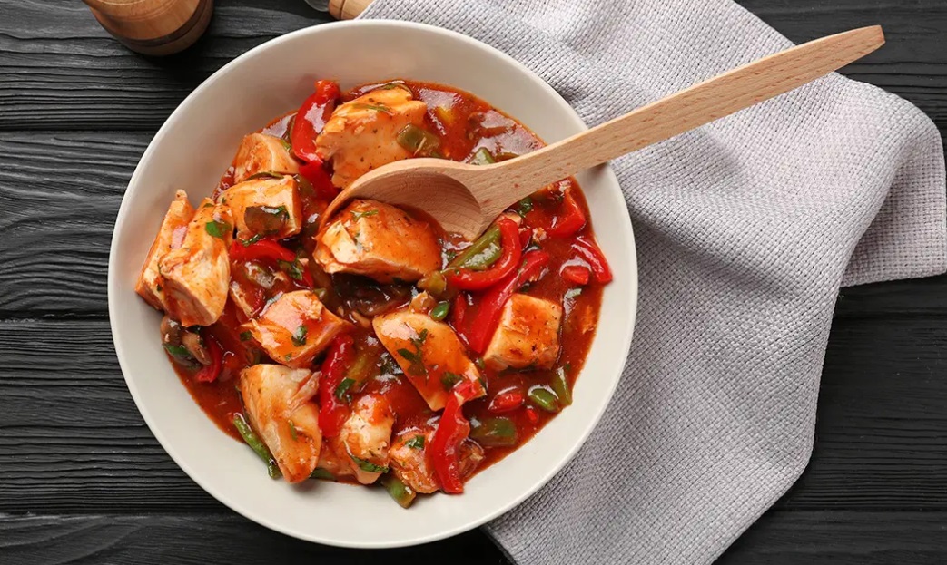 800 g piščančjega mesa brez kože in kosti 4 večje čebule 4 stroke česna 1 rdeča paprika 1 zelena paprika 1 feferon 1 žlička nasekljanega peteršilja sol in poper po okusu 0,3 dl oljčnega olja 300 ml paradižnikove omake 200 ml piščančje jušne osnove 150 ml belega vina