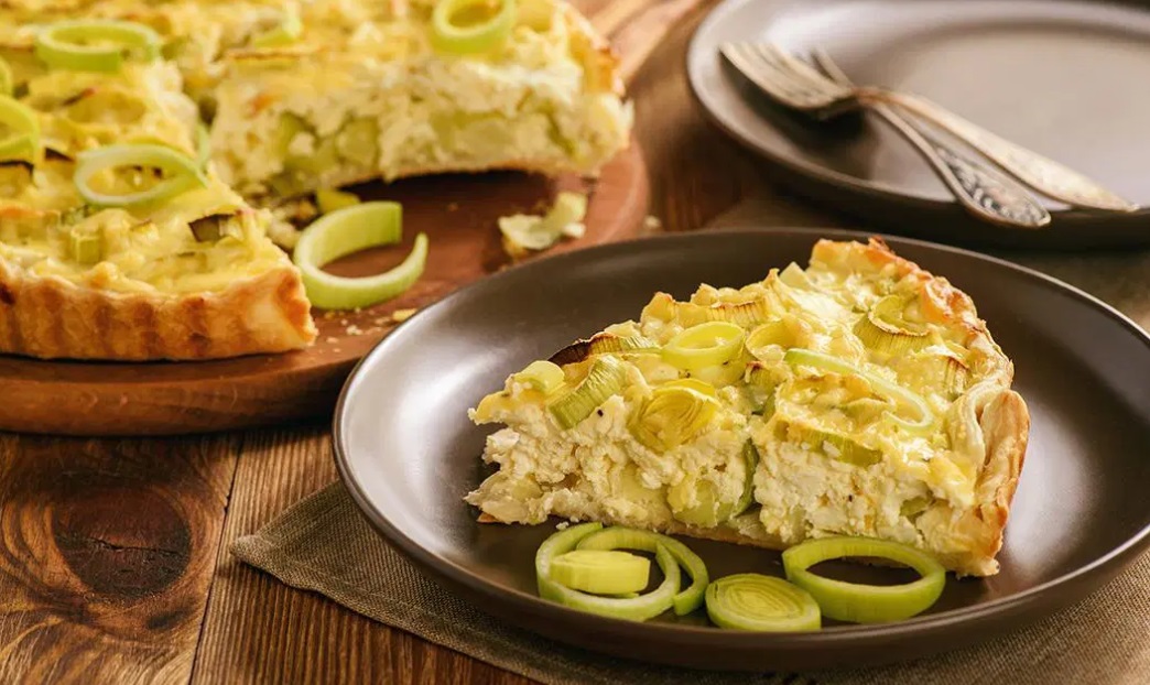 2 večja pora 2 jajci 3 dl smetane za kuhanje 100 g naribanega sira – edamec 50 g sveže naribanega parmezana 200 g moke 150 g masla sol, poper bazilika kurkuma muškatni orešček šopek peteršilja