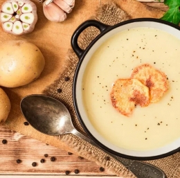 8 strokov česna 1 por 4 krompirji 4 žlice olja 1,5 l jušne osnove ali vrele vode kumina 1 jajce 1,5 dl sladke smetane peteršilj