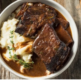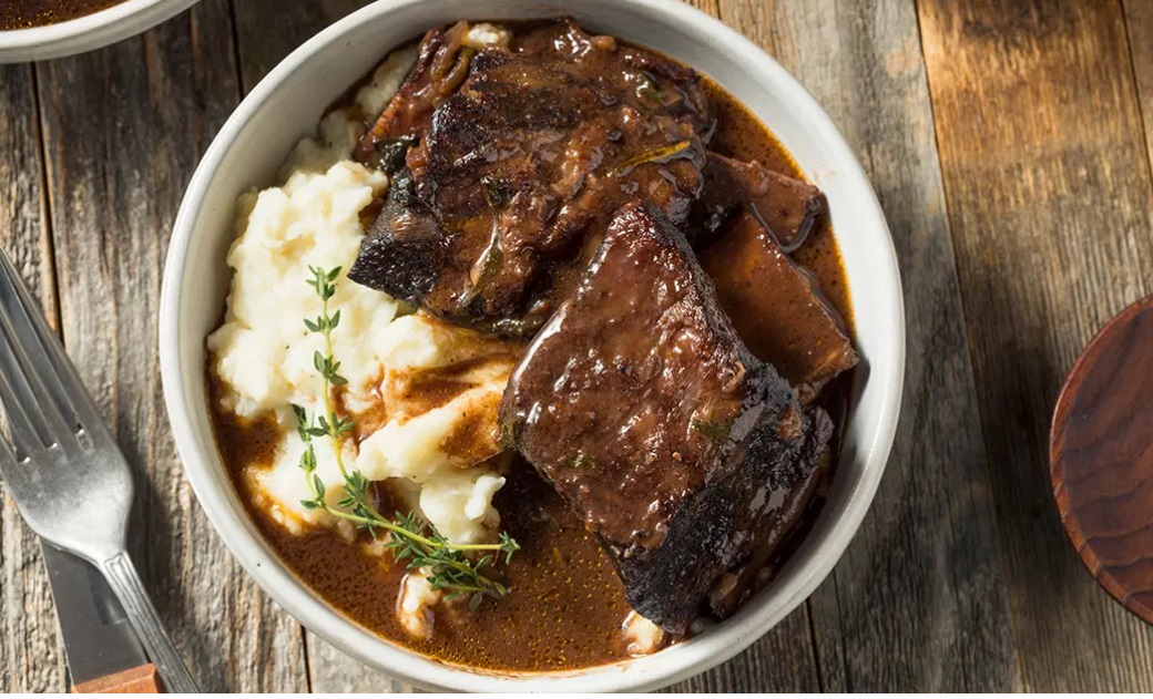 Zrezke damo nazaj v ponev, zalijemo z rdečim vinom in na močnem ognju pustimo nekaj minut, da povre ves alkohol. Zalijemo z vročo jušno osnovo, zmanjšamo ogenj in pokrito dušimo, dokler niso zrezki mehki, vsaj uro in pol.