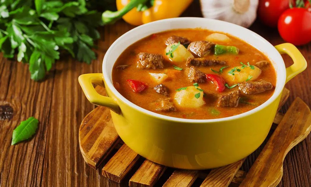 250 g čebule 1,5 kg bolj mokastega krompirja 200 g govedine 1 žlica olja 2 stroka česna 2 žlici sladke paprike 4 žlice paradižnikove mezge 150 g kisle smetane sol poper ščepec kajenskega popra 500 ml mesne jušne osnove 1 šopek peteršilja 1/4 paprike