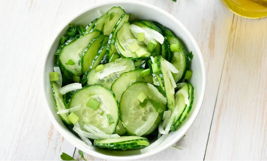 4 večje kumare 1 majhna čebula 1 žlica oljčnega olja kis poper sol