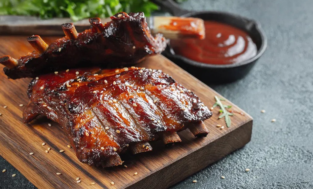 Meso v kosu namažemo z marinado, postavimo v hladilnik in pustimo počivati vsaj 10 ur, še bolje čez noč. Pečico segrejemo na 200 stopinj, rebrca narežemo na 4 cm debele kose in jih polagamo na pekač, ki ga obložimo s peki papirjem. Rebrca naj se med peko ne dotikajo med seboj, da se zapečejo enakomerno.