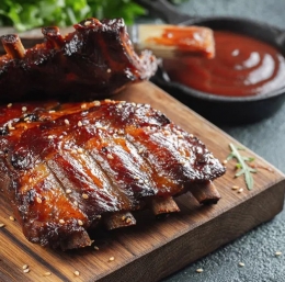 Zraven položimo še vejico timijana in rožmarina. Rebrca pečemo 1 uro, dokler niso lepo zapečena. Med peko jih enkrat obrnemo. Postrežemo vroče in zraven po želji ponudimo še marinado za pomakanje.