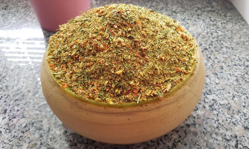 Suho zelenjavo zmeljemo v multipraktiku, nato pa jo v primerno veliki posodi dobro zmešamo s soljo in kurkumo. Shranimo jo v sterilne steklene kozarce.