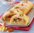 S pomočjo prta testo zavijamo, začnemo na tistem koncu, kjer so nadevane brusnice. Na koncu ga prestavimo na peki papir in sicer tako, da je spoj na dnu. Naš štrudelj s papirjem postavimo na pekač. Dobro ga premažemo s stopljenim maslom.