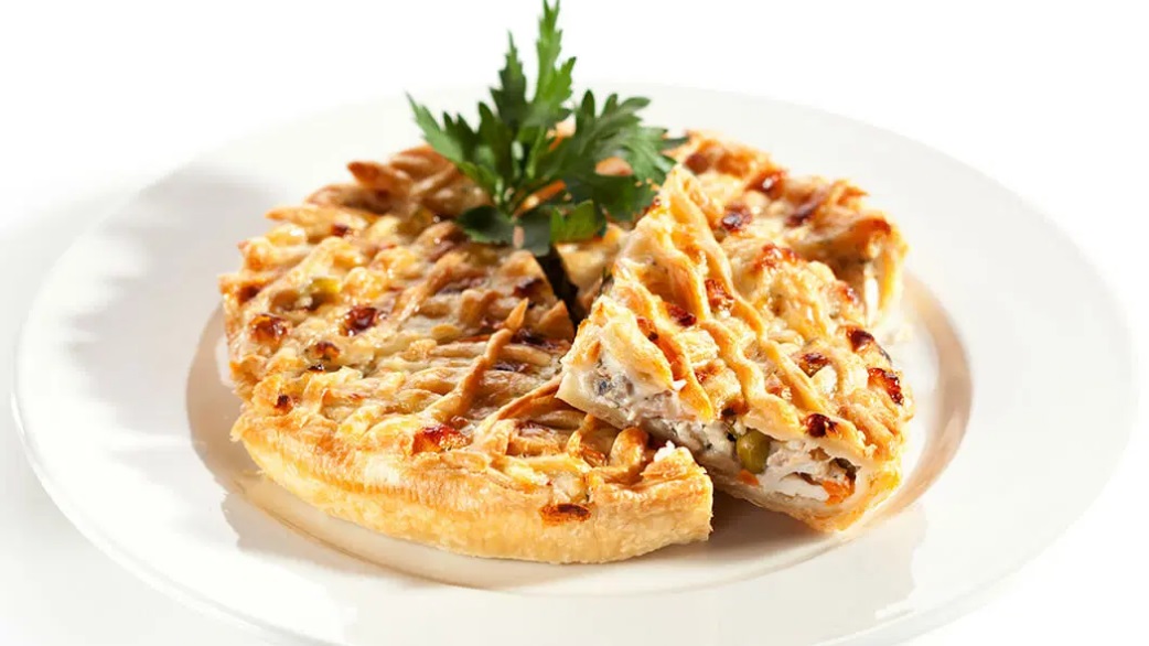 Piščančje prsi:Piščančje prsi imajo nežen in nekoliko sladek okus. Ko so kuhana in narezana na majhne kose, postanejo sočna in mehka, kar obogati okus pite in dodajo beljakovine.