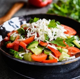 1 čebula 500 g paradižnika 200 g ovčjega sira 1/2 dl olja 1 pekoč feferonček 1 kumara sol