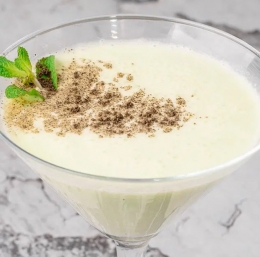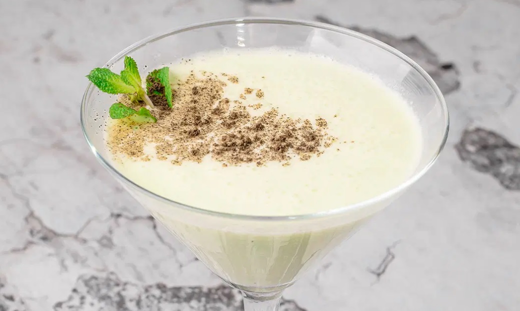Nalijemo v ohlajen kozerec za martini, posujemo z muškatnim oreščkom in okrasimo z meto.