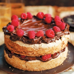 Ohlajeno meringo previdno vzamemo iz modlov in eno plast položimo na servirni krožnik. Polovico malin rahlo potlačimo z vilicami. Prvo plast meringe s paletnim nožem premažemo s polovico čokoladne kreme in obložimo z malinami. Nanje položimo drugo plast meringe, premažemo s preostalo čokoladno kremo in okrasimo s preostalimi (celimi) malinami.