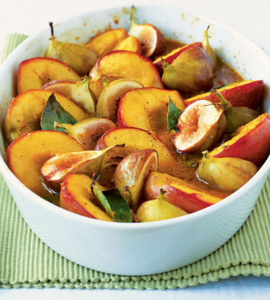 4 lovorovi listi 2 cimetovi skorjici 1 vaniljev strok 4 semena iz polovice zvezdastega janeža ½ žličke sveže mletega črnega popra nastrgana lupina in sok 3 pomaranč 4 žlice tekočega medu 3 žlice svetlega sladkorja muskovado 6 svežih breskev ali nektarin 6 svežih fig 25 g masla