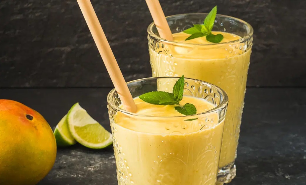 13 cl navadnega jogurta 120 g olupljenega in na kocke narezanega manga 1 žlička rjavega sladkorja 25 cl ledeno hladne vode kocke ledu meta za okras