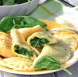 Izdolbemo 25 krogov s premerom 10 cm. Robove namažemo z beljakom. Na vsak krog naložimo žlico nadeva, kroge prepognemo in dobro zatisnemo robove., pomagamo si z vilicami.