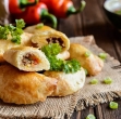 Žepke naložimo na pekač, rumenjak razžvrkljamo z dvema žlicama mleka in z mešanico premažemo žepke. Pustimo jih vzhajati še 15 minut, nato jih pečemo 20 minut, da se zlato rjavo obarvajo. Postrežemo vroče.