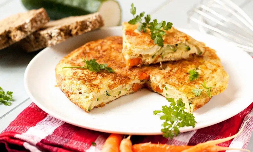 1 večja bučka 3 korenčki 1 čebula 2 stroka česna 200 ml smetane za kuhanje 4 jajca 50 g parmezana sol in poper muškatni orešček drobnjak in peteršilj oljčno olje