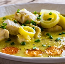 2 pora 3 ali 4 krompirji 2 korenčka 300 g piščančjih prsi šopek drobnjaka ali peteršilja olje, zeliščna sol, poper, kumina