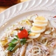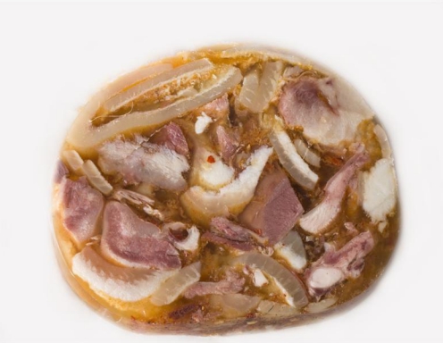 Skledo napolnimo z rezinami jajc in vanjo vlijemo tekočino. Pustimo, da se ohladi na sobni temperaturi. Šele nato postavimo v hladilnik. Ko se masa strdi, skledo na spodnji strani polijemo z vročo vodo. Z nožem previdno odstranimo žolco z roba sklede in vso maso stresemo na krožnik. Narežemo na več delov in postrežemo z zmesjo iz čebule, jabolčnega kisa in rastlinskega olja. Solimo in popramo.