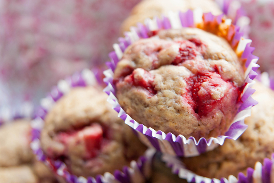 Dodajte rastlinsko olje, jajco, mleko in mešajte dokler ne dobite gladke zmesi. Na koncu vmešajte sesekljane jagode. Z žlico napolnite modelčke ali pekač ter postavite v pečico. Muffine pecite dokler ne postanejo zlato rjavi po vrhu, približno 15 – 20 minut.