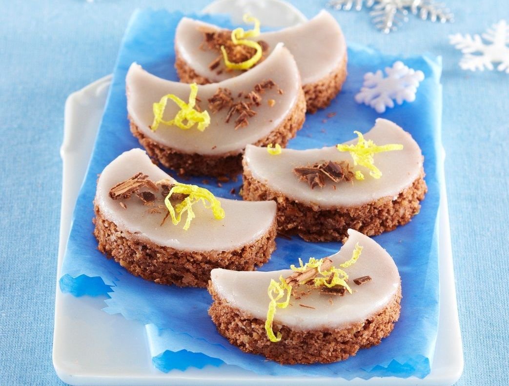 Ko se pečeno testo ohladi do mlačnega, ga po vrhu prelijemo s pripravljenim prelivom in pustimo, da se strdi. Iz testa s pomočjo posebnega modelčka ali kozarca izrežemo lunice, ki jih polagamo na servirni krožnik ali pladenj. Poljubno jih okrasimo (limonina lupinica, nastrgana čokolada, mrvice, perlice) in postrežemo.