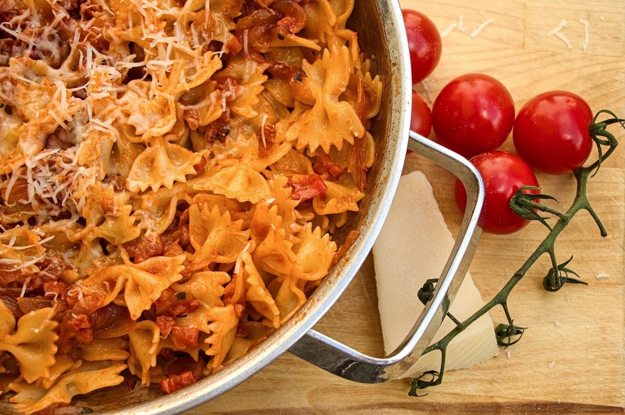 400 g testenin (priporočamo farfalle ali katerekoli druge kratke testenine), 250 g mletega mesa (govedina ali mešanica govedine in svinjine), 1 čebula, drobno sesekljana, 2 stroka česna, drobno sesekljana, 400 g pelatov (ali svežih paradižnikov, olupljenih in narezanih), 1 žlica paradižnikove mezge, 1 dcl belega vina (opcijsko), 2 žlici olivnega olja, 1 žlička sladkorja, 1 žlička suhega origana ali bazilike, sol in poper po okusu, parmezan za posip.
