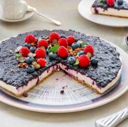 Kvark pita z borovnicami in chia semeni je osvežujoča, lahka sladica, ki združuje kremasto teksturo vanilijevega kvarka in grškega jogurta s hrustljavo osnovo iz ovsenih kosmičev, pekanov in datljev. Preliv iz borovnic in chia semen doda osvežilno sadno noto, ki se popolnoma ujema s kremnim nadevom.