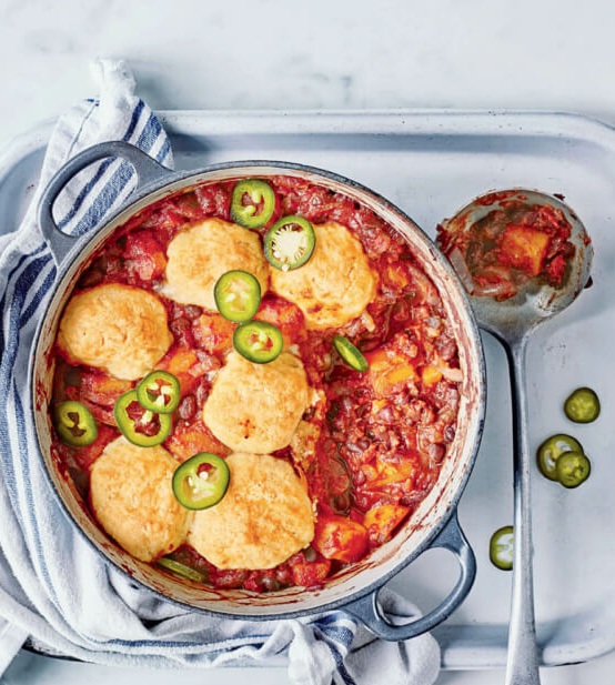 Testo oblikujemo v 8 kroglic. Položimo jih na vrh enolončnice in odkrito kozico postavimo v pečico za 15 do 20 minut ali toliko časa, da cmoki narastejo in se rahlo zlato rjavo obarvajo. Enolončnico po želji posujemo s čilijem jalapeño, narezanim na tanke kolobarčke, in postrežemo.