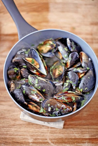 V kozico stresemo školjke in jih zmešamo z omako. Dobro pokrijemo in pustimo, da se kuhajo v pari 3 do 4 minute oziroma dokler se lupine ne odprejo; na sredini kuhanja kozico pretresemo.