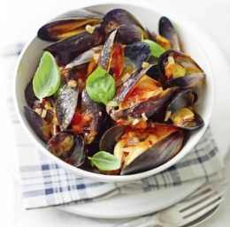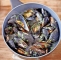Zavržemo školjke, ki so ostale zaprte, druge pa razdelimo v dve skledi in jih potresemo z lističi bazilike. Zraven pripravimo veliko skledo za prazne lupine.
