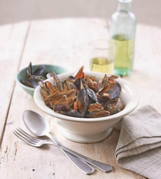 Tekočino od školjk dve minuti kuhamo, nato pa vanjo vmešamo kislo smetano. Omako samo še segrejemo in prelijemo po školjkah. Postrežemo s hrustljavim kruhom.
