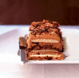 Ohlajeno kavno razdelimo na tri dele. V en del vmešamo brendi in vanj pomočimo 7 piškotov savoiardov, ki jih nato drugega poleg drugega zložimo na podolgovat servirni pladenj. Pokrijemo jih s tretjino kavne kreme in potresemo s tretjino sesekljane čokolade. Drugi del kave zmešamo z rumom, vanj pomočimo mandljeve piškote in jih zložimo na čokolado. Pokrijemo jih z drugo tretjino