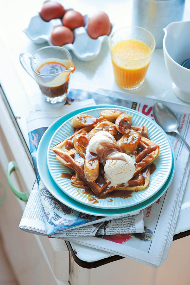 Tik preden postrežemo, olupimo banani in ju narežemo na večje kose. Pri srednji temperaturi v teflonski ponvi segrejemo žlico masla in na njem pečemo kose banane, dokler ne dobijo zlate barve. Vaflje razdelimo na 4 krožnike, nanje položimo pečene banane, jih prelijemo s karamelom, na vrh pa po želji položimo kepico vaniljevega sladoleda.