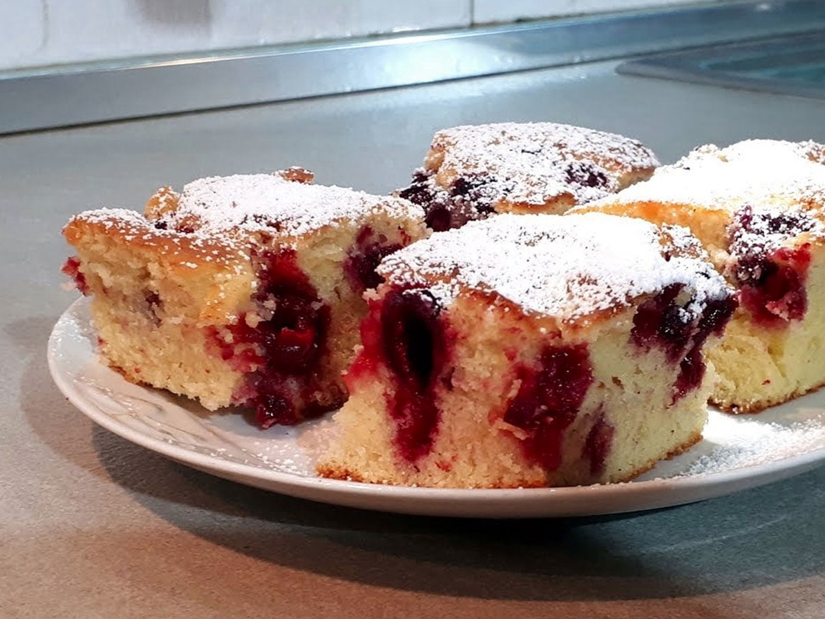 Preprosto višnjevo pecivo, ki ga obožujejo odrasli in otroci. Je mehko, puhasto, ravno prav sladko in odlično ob kavi ali čaju. Sestavine so enostavne kot tudi sama priprava. Lahko ga pripravite tudi skupaj z otroci.