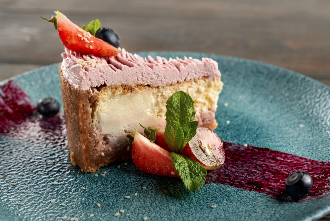 Okrasite sirov kolač s svežimi jagodami, borovnicami in lističi mete. Postrezite ohlajeno.
