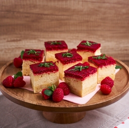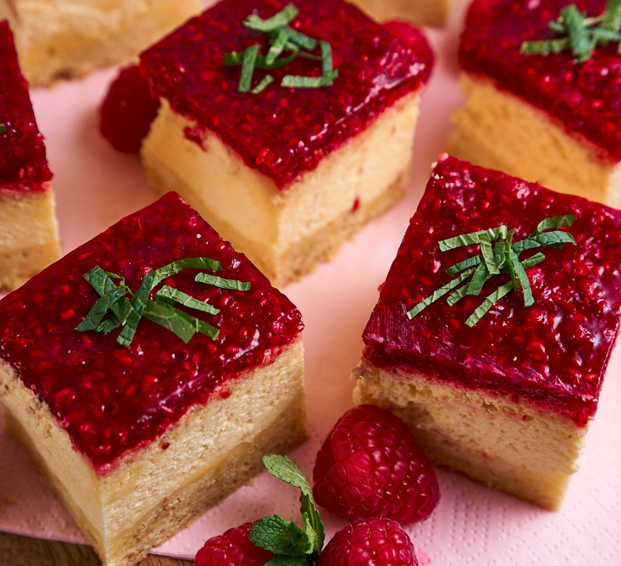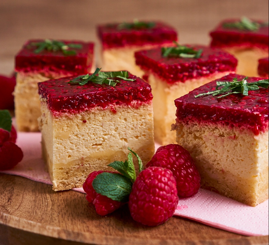 Kocke sestavljene iz krhkega testa, kreme iz kisle smetane in vanilijevega pudinga ter preliva iz malin. Ta krema mi je zelo všeč, saj pudinga predhodno ni potrebno kuhati. Preliv lahko pripravimo tudi iz katerega drugega sadja, meni so maline najbolj všeč ker so kisle in vsaki sladici dodajo piko na i s svežino.