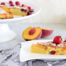 Clafoutis je sočen jajčni kolač s sadjem, ki izvira iz Francije. Za pripravo preprost, v njem pa se prepletajo preprosti okusi sadja, jajc in vanilije in različne strukture; kot puding mehka sredica in krhka skorjica, posuta s sladkorjem v prahu. Clafoutis je najboljši kar topel, zraven pa se odlično prileže kepica vanilijevega sladoleda. Prav tako dober pa je tudi ohlajen. V originalu je pripravljen s češnjami, a je dober prav z vsem sadjem. Lahko izberemo le 1 sadje ali pa kar mešano sadje, jaz sem uporabila slednje. Pa si poglejmo recept.