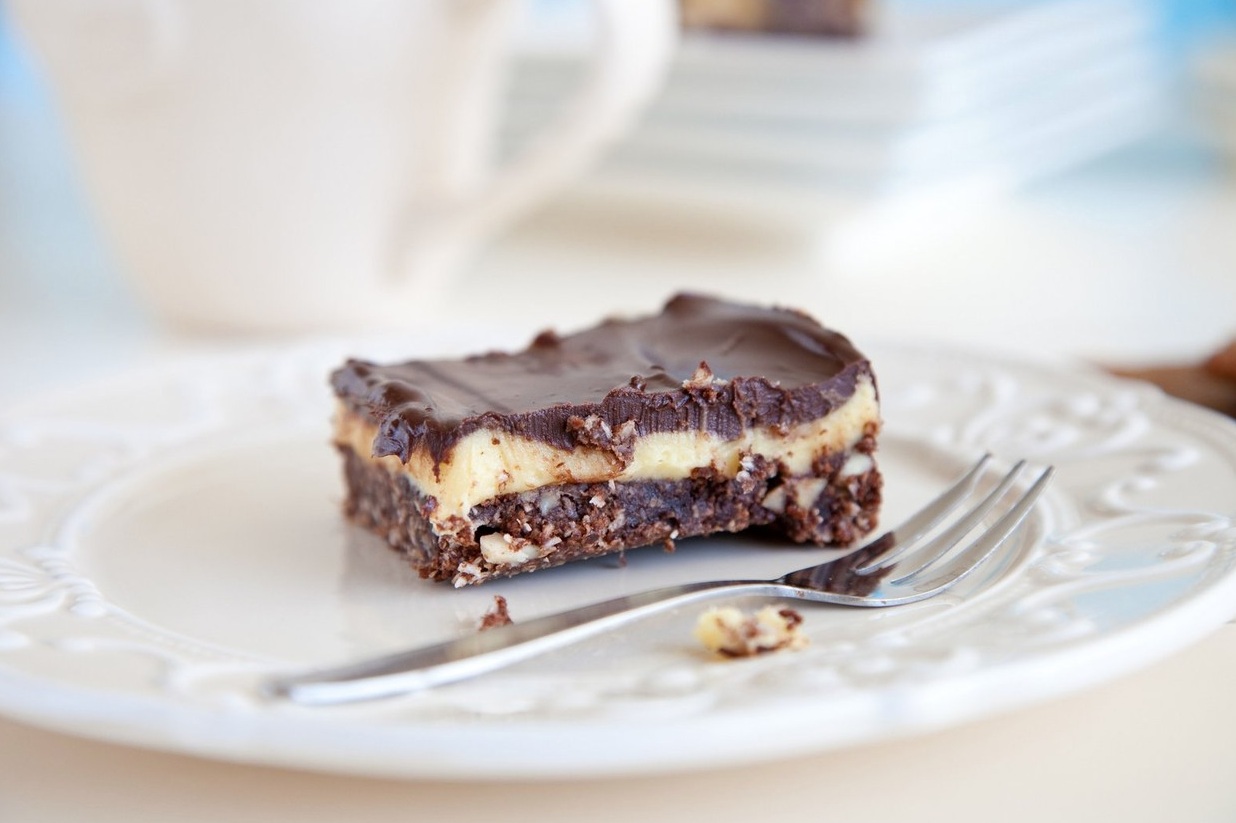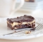 Jajci stepemo in nekaj žlic zmesi vmešamo v jajci, premešamo, da dobimo enakomerno zmes, in potem vse skupaj med nenehnim mešanjem dodamo vsebini v ponvi. Dodamo še drobtine iz temnih keksov, kokosove kosmiče in mandlje ali druge oreške. Zmes damo v pekač, jo poravnamo in damo za vsaj pol ure v hladilnik.