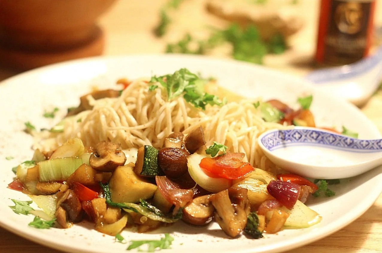 200 g azijskih rezancev (riževi, jajčni ali soba). 150 g šampinjonov ali drugih gob. 1 bučka. 1 rdeča paprika. 1 rdeča čebula. 2 stroka česna. 1 manjši por ali pak choi (kitajsko zelje). 1 žlica sezamovega olja. 2 žlici sojine omake. 1 žlica ostrigine omake (opcijsko). 1 žlička naribanega ingverja. ½ žličke čilijevih kosmičev (opcijsko). Svež koriander ali peteršilj za okras.