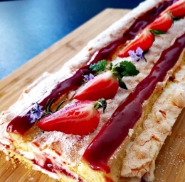 Pecivo po vrhu okrasimo z marmelado, sladkorjem v prahu in svežimi jagodami.