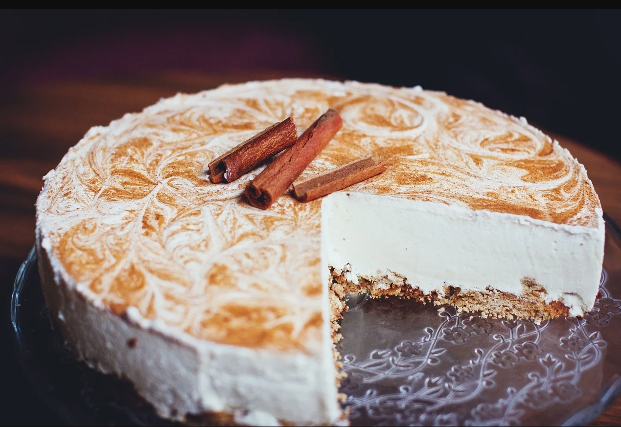 Pred postrežbo stepite preostalo sladko smetano s sladkorjem v prahu, dokler ne nastanejo trdi vrhovi. Polovico smetane razporedite po vrhu torte in z lopatico ustvarite nežne valovite vzorce. V preostalo smetano vmešajte cimet in z njo ustvarite marmorirane vzorce po površini torte – to lahko naredite z žlico ali vrečko za dekoriranje.