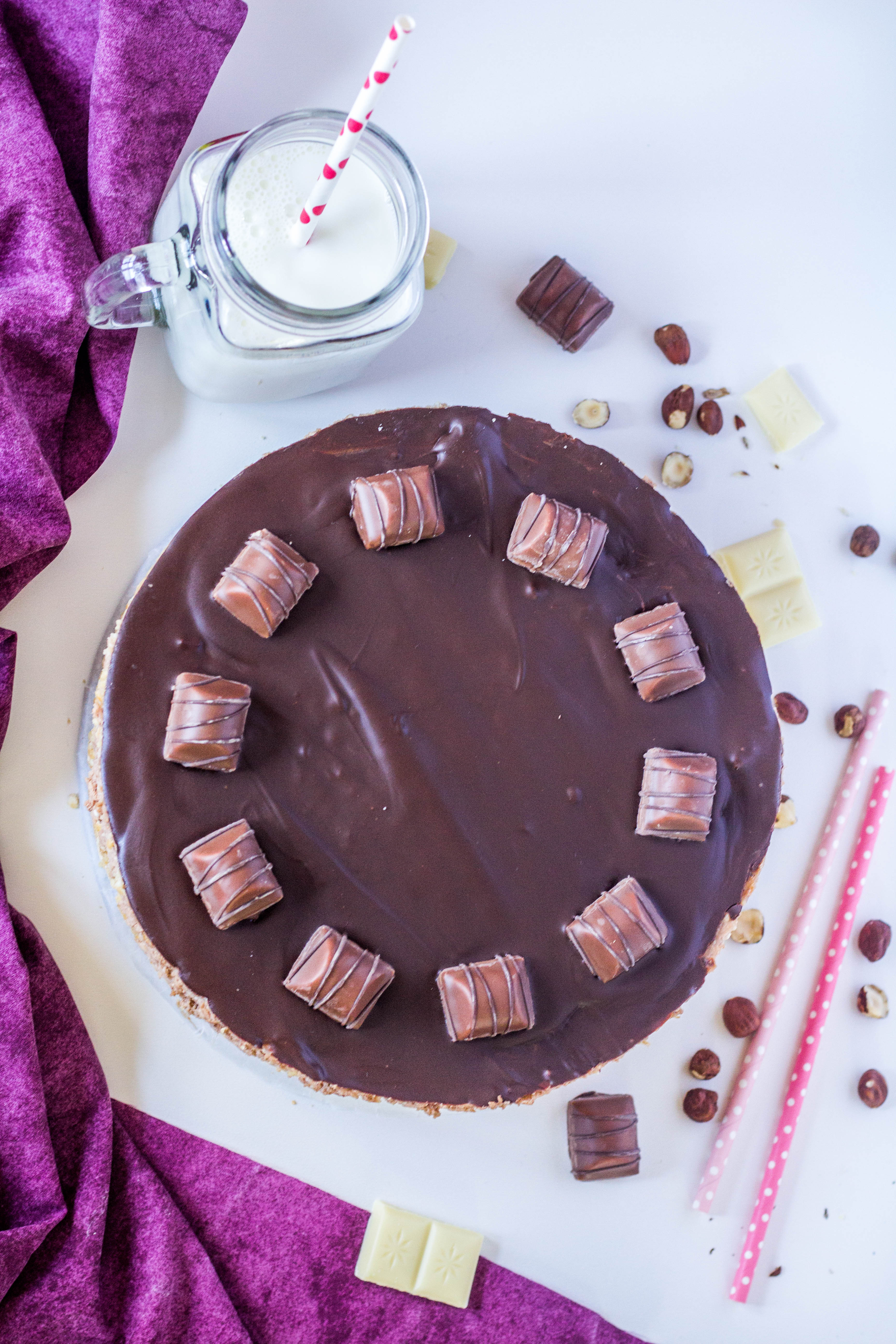 Čokolado stopite v vodni kopeli in jo prelijte po sirovi torti. Takoj po obodu razporedite 12 mini Kinder Buenos piškotov.